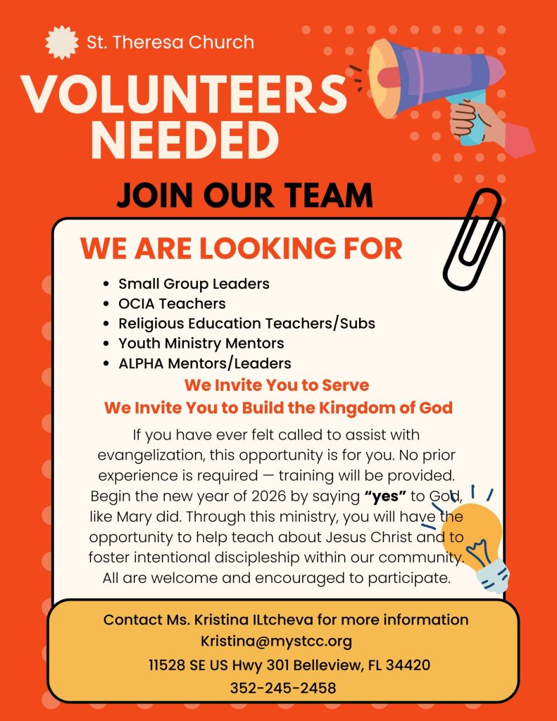 If you or someone you know need prayer, call the St Theresa Prayer Hotline (352) 496-1569, 24 hours a day to have a member of the Prayer Team pray with you.